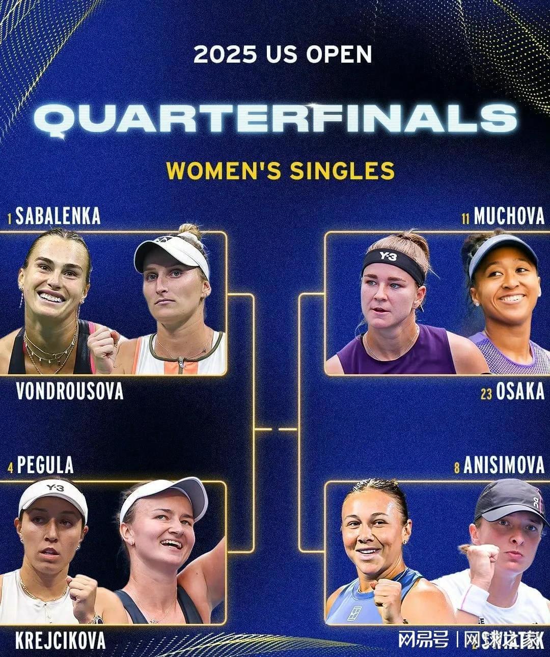 当世界第三高芙被淘汰后,由萨巴伦卡、万卓索娃、佩古拉、克雷吉茨科娃、穆霍娃、大坂直美、斯瓦泰克和阿尼西莫娃组成的本届美网女单八强阵容正式尘埃落定。